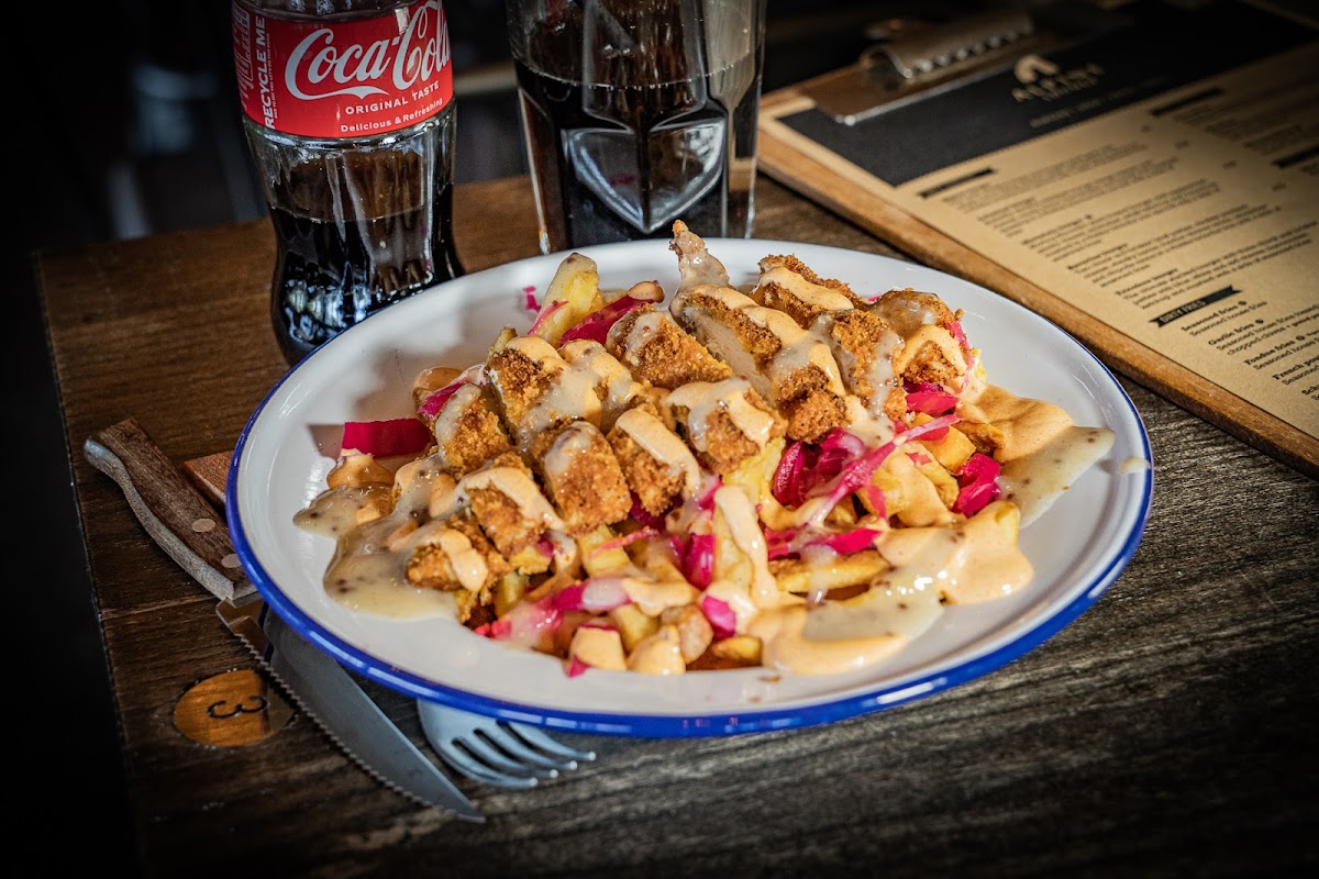 Seasoned fries, sliced chicken schnitzel, sauerslaw, honey and mustard sauce and chipotle sauce